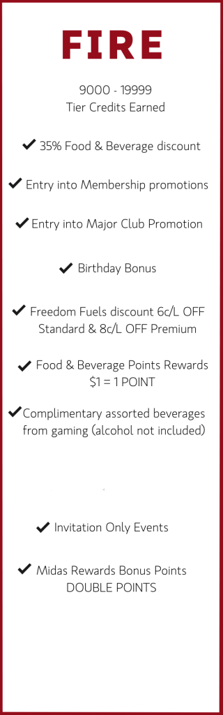 Your ‘Midas Tier level’ is determined by the amount of ‘Tier Credits’ you accrue over a 3 month period. Existing members will be allocated a level based on their current accrued ‘Tier Credits’. All new members will begin at the base level of ‘Air’.