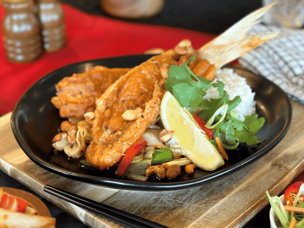 Picture succulent snapper fillets coated in a crunchy sesame batter accompanied by a vibrant stir-fry sautéed in ginger and garlic sauce. This is then served alongside a bed of steamed rice & to top it all off, a sprinkle of toasted cashews and fresh herbs.